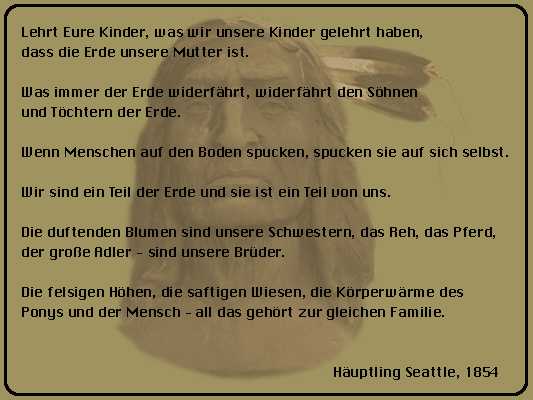 H ä u p t l i n g S e a t t l e mit seiner Weisen Rede and den (unbewussten) Weißen Mann Ergreifend aktuelle Weisheit aus dem 19. Jahrhundert ![]() hier die gesamte Originalrede als PDF-Datei ![]() hier als wunderbares Erlebnis anhören ![]() und hier als Live-Lesung - 1. Teil 2. Teil (Die Rede beginnt im 1. Teil erst ab Min. 1:55) ![]() und hier als Lied von Hannes Wader |